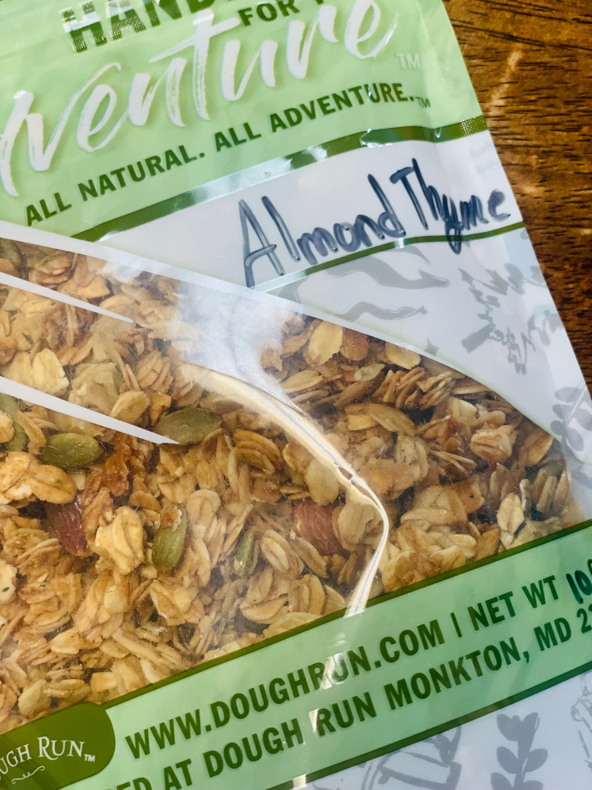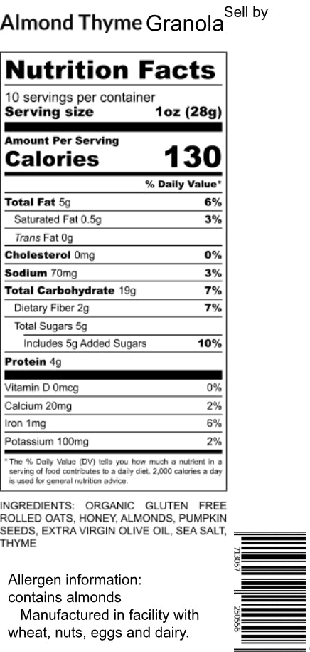 Made with organic gluten free oats, organic pumpkin seeds, almonds, honey, olive oil, thyme and sea salt.