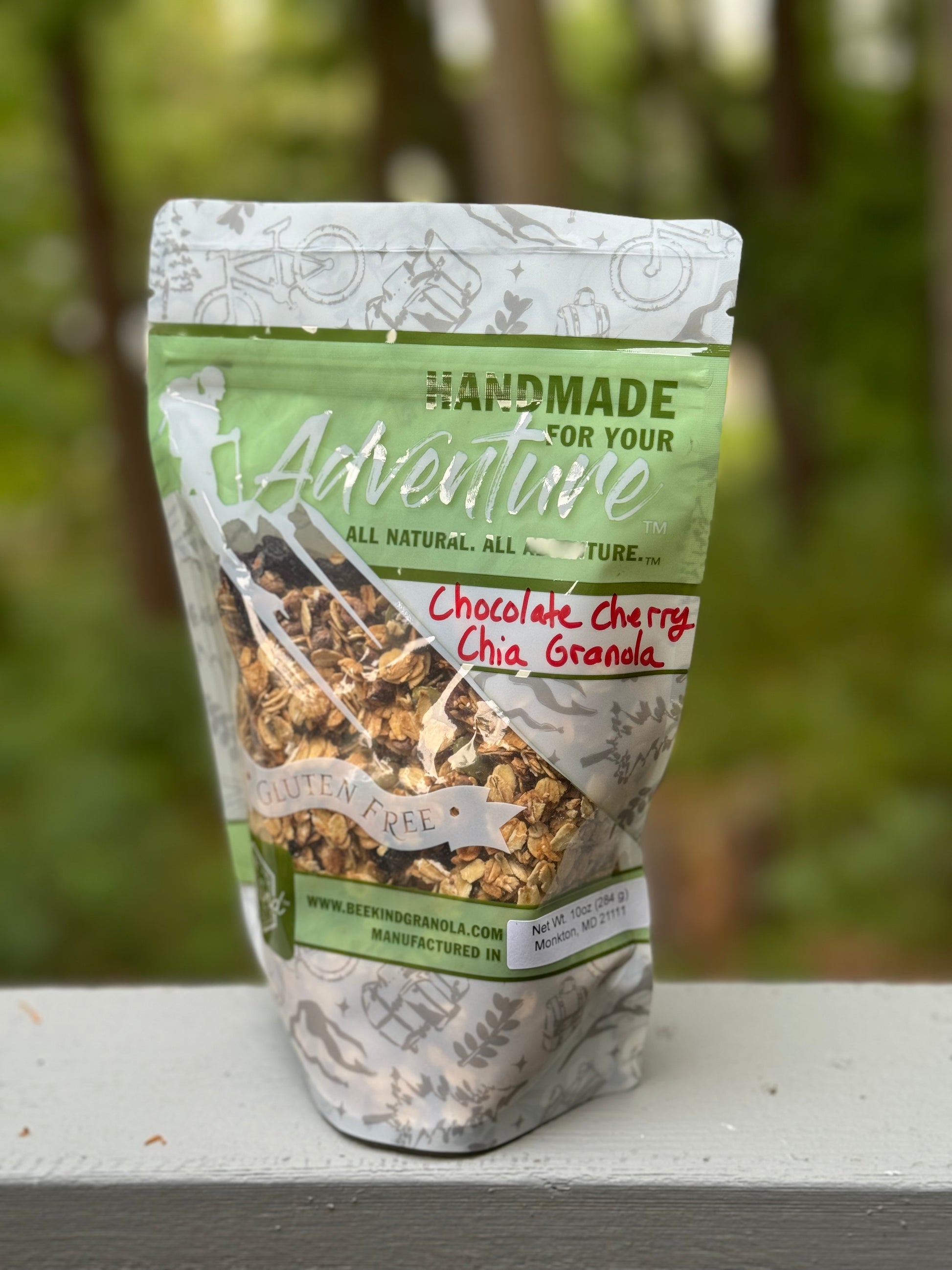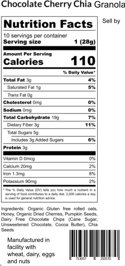 Made with organic gluten free oats, pumpkin seeds, honey, semi sweet chocolate chips (cane sugar, unsweetened chocolate and cocoa butter) dried cherries and chia seeds.