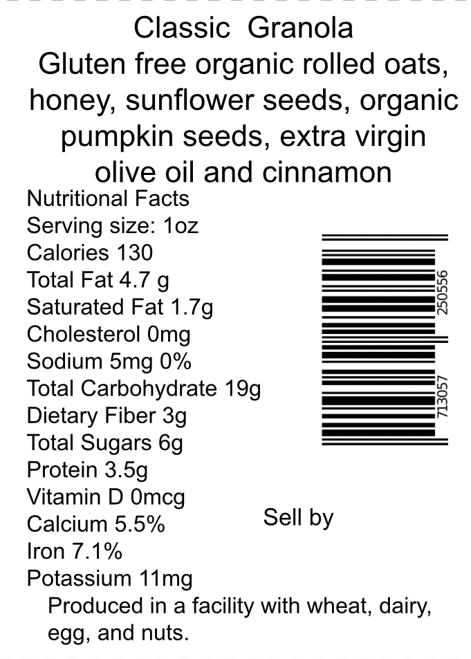 Made with organic oats, organic pumpkin seeds, sunflower seeds, honey, olive oil and cinnamon.