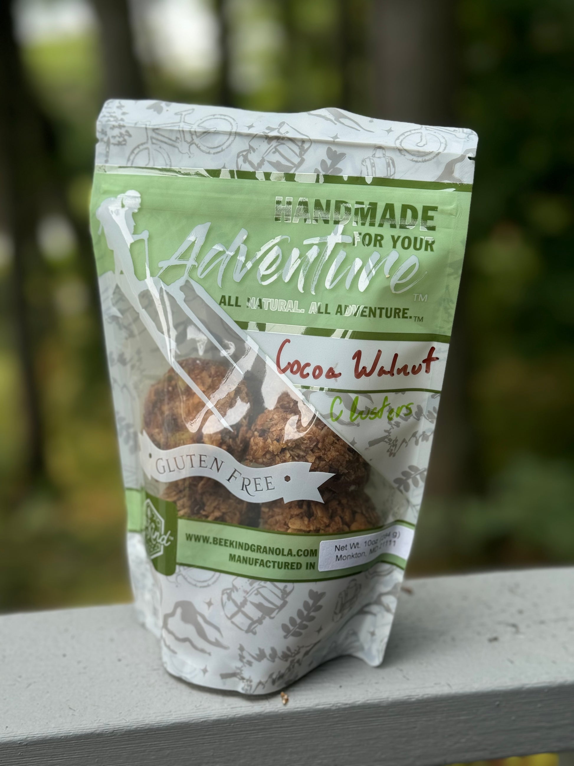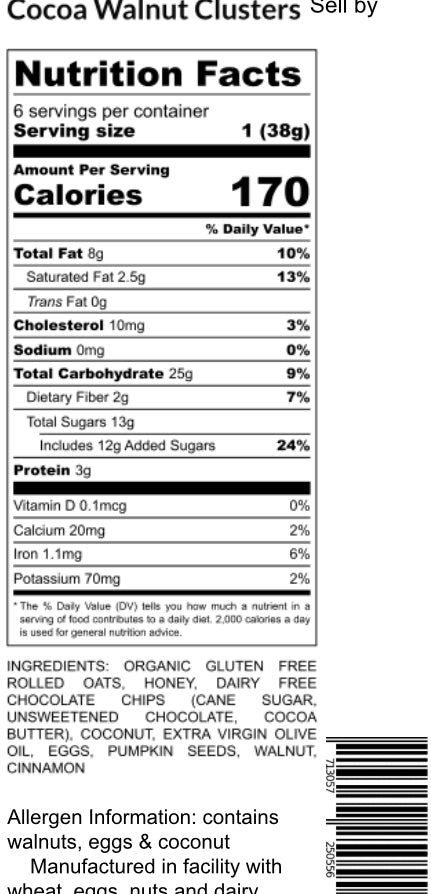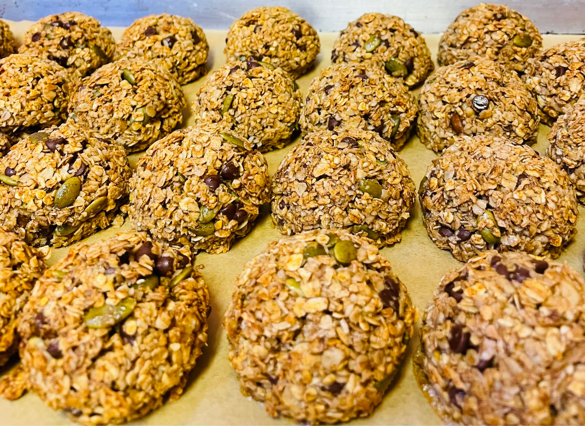 Granola ball type made with organic gluten free oats, honey, unsweetened coconut, walnuts, chocolate chips (raw sugar, unsweetened chocolate and cocoa butter), organic pumpkin seeds, local free range eggs, olive oil, and cinnamon