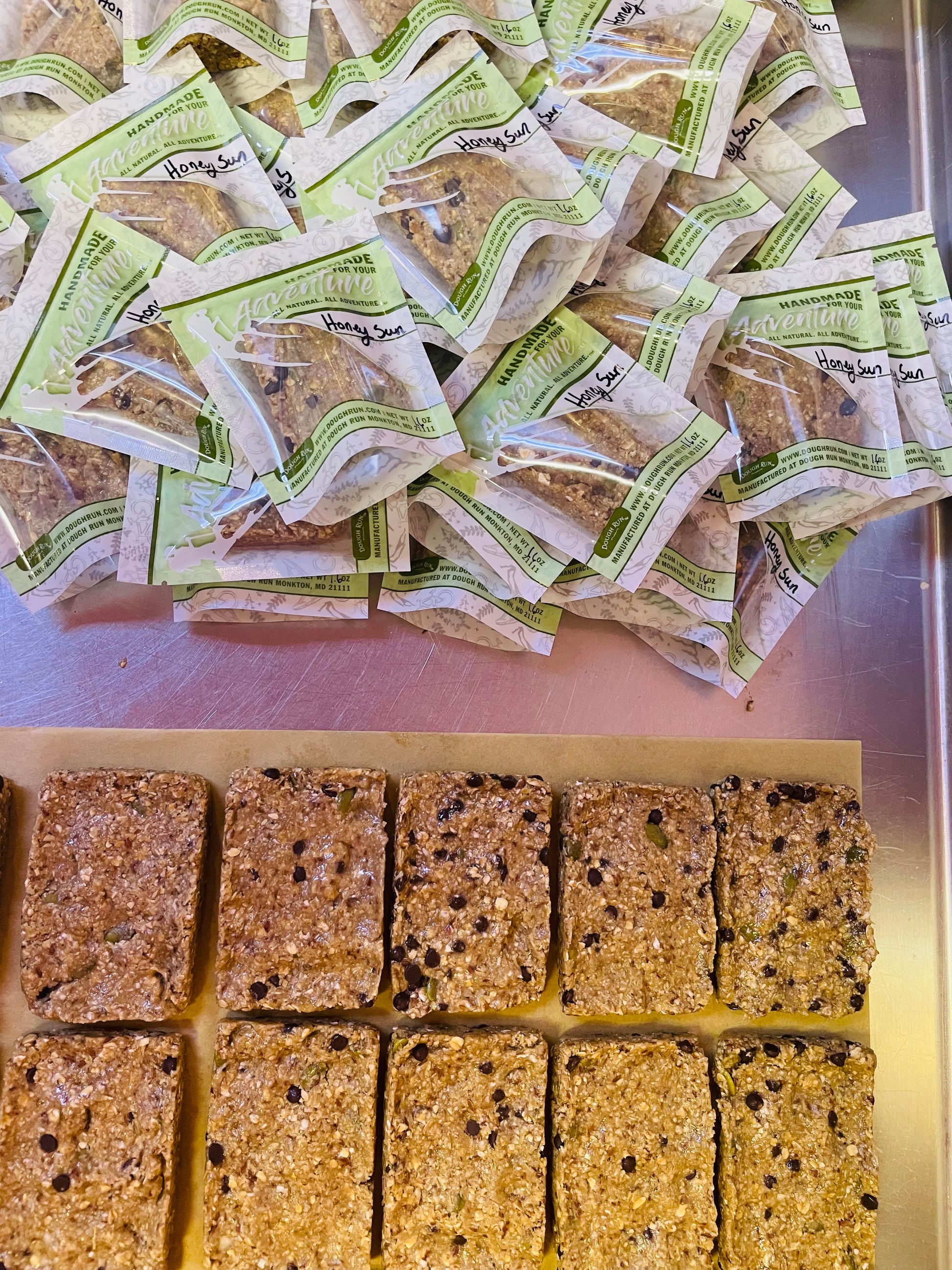 Made with gluten free organic oats, local honey, sunflower butter, rice syrup, vegan mini chips (unsweetened chocolate, cocoa butter, cane sugar), raw pumpkin seeds, ground flaxseeds and cinnamon.