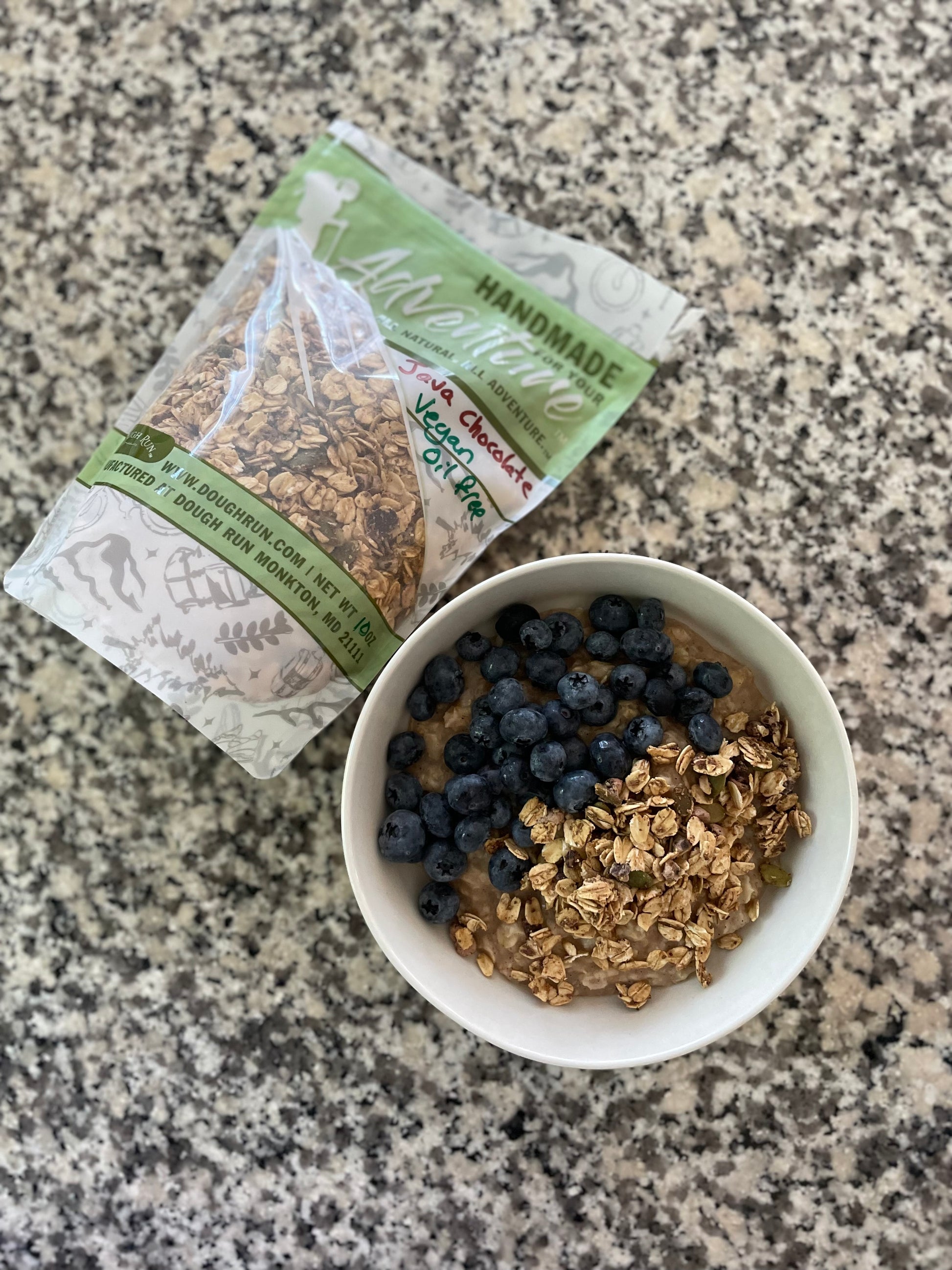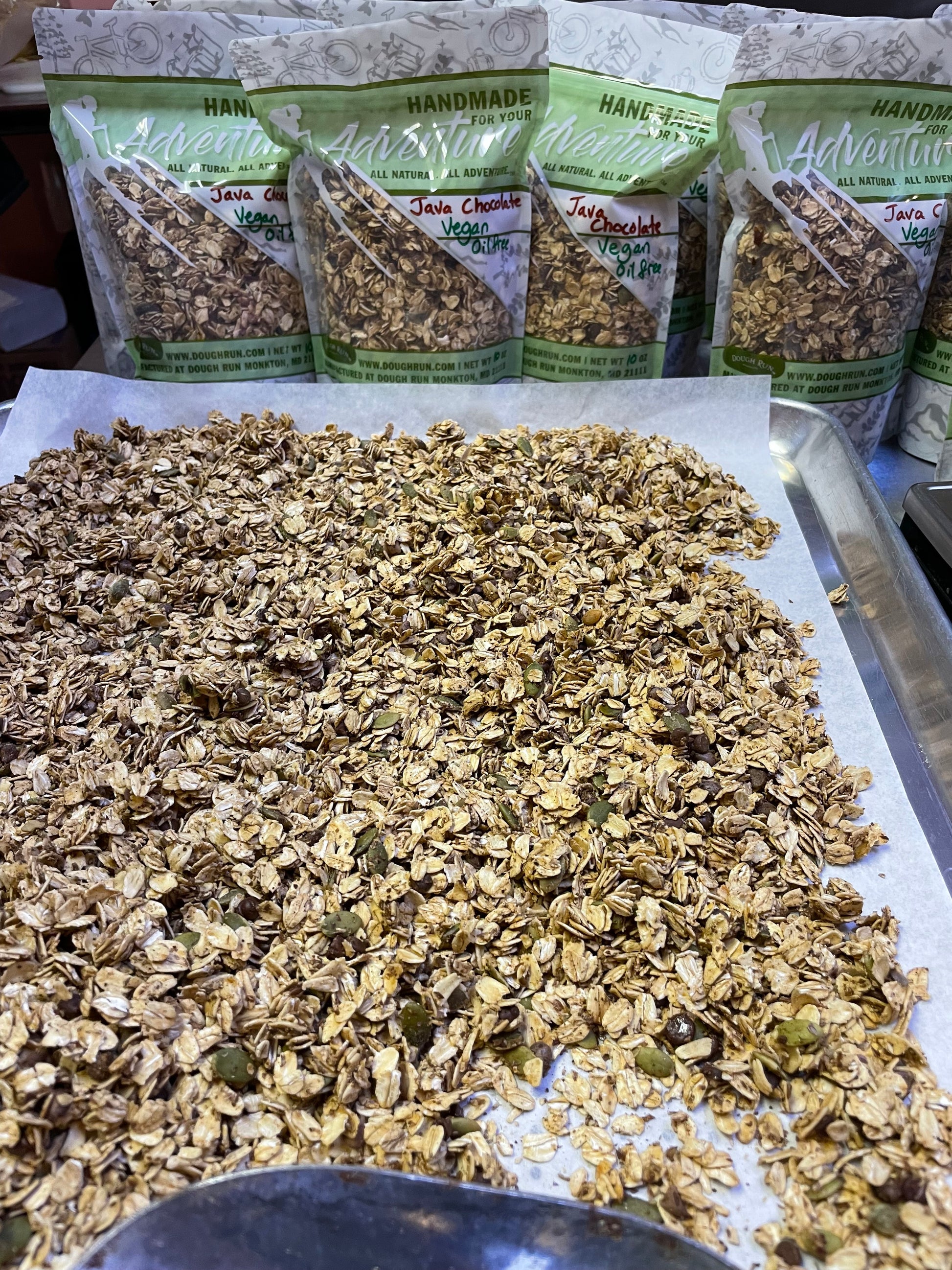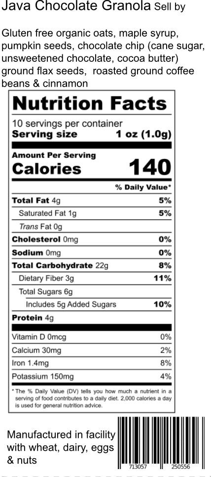 Made with organic gluten free oats, maple syrup, organic pumpkin seeds, organic ground flaxseeds, semi sweet chocolate chips (unsweetened chocolate, raw sugar and cocoa butter) and cinnamon.