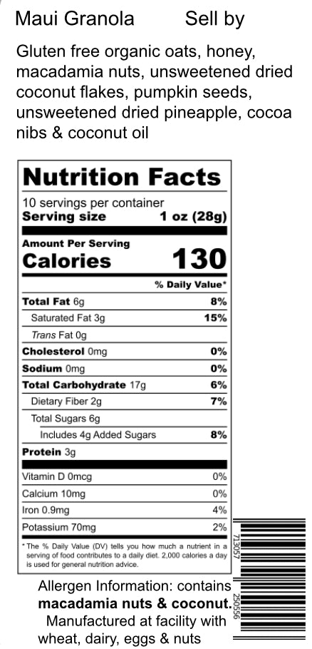 Made with organic gluten free oats, organic pumpkin seeds, unsweetened coconut, honey, coconut oil, unsweetened dried pineapple, macadamia nuts and cocoa nibs.